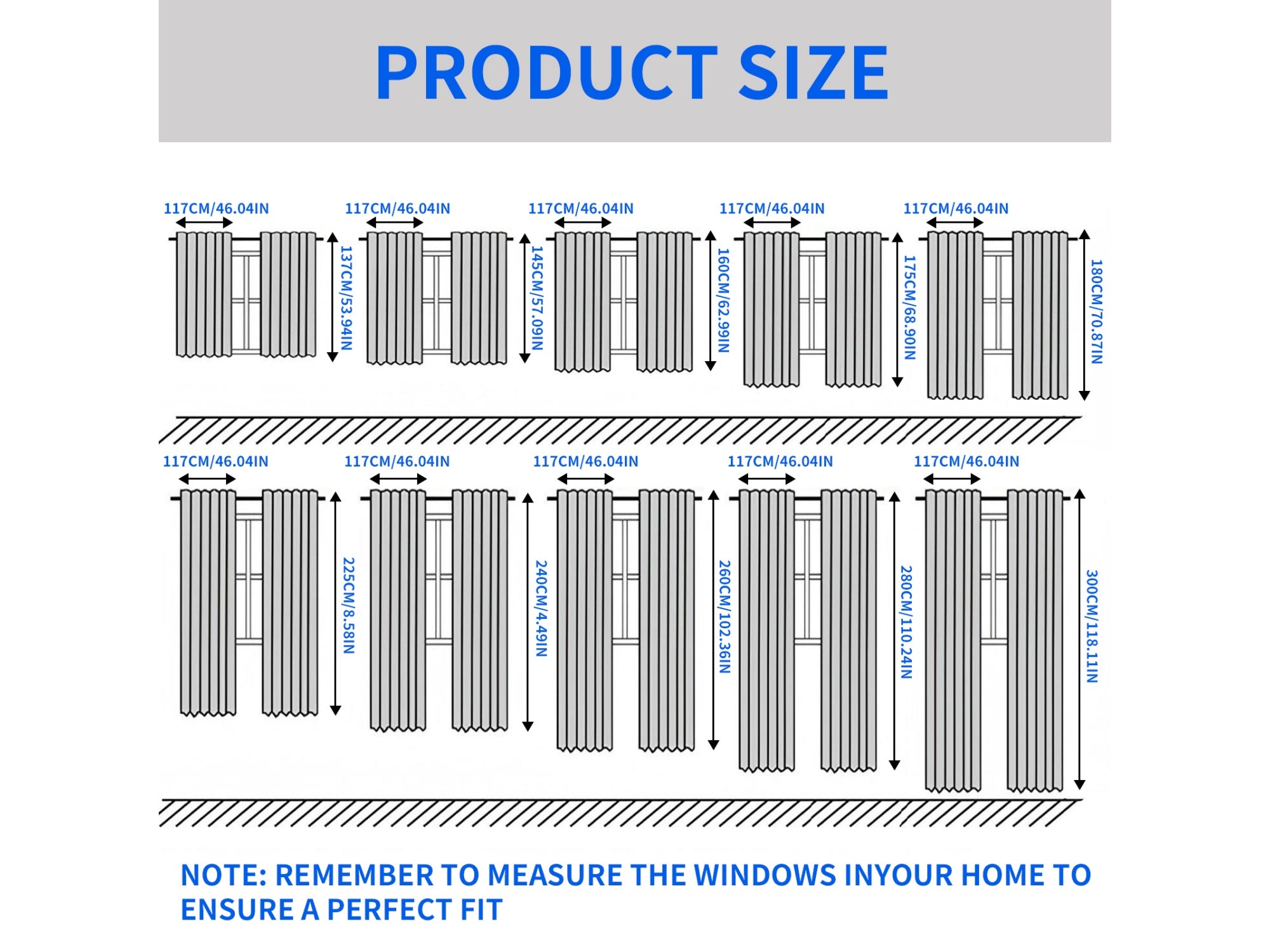 Each panel is117cm / 46.04in wide, with multiple length options to match different window heights. Please measure your window (and curtain rod height) before ordering to ensure the best look and coverage.