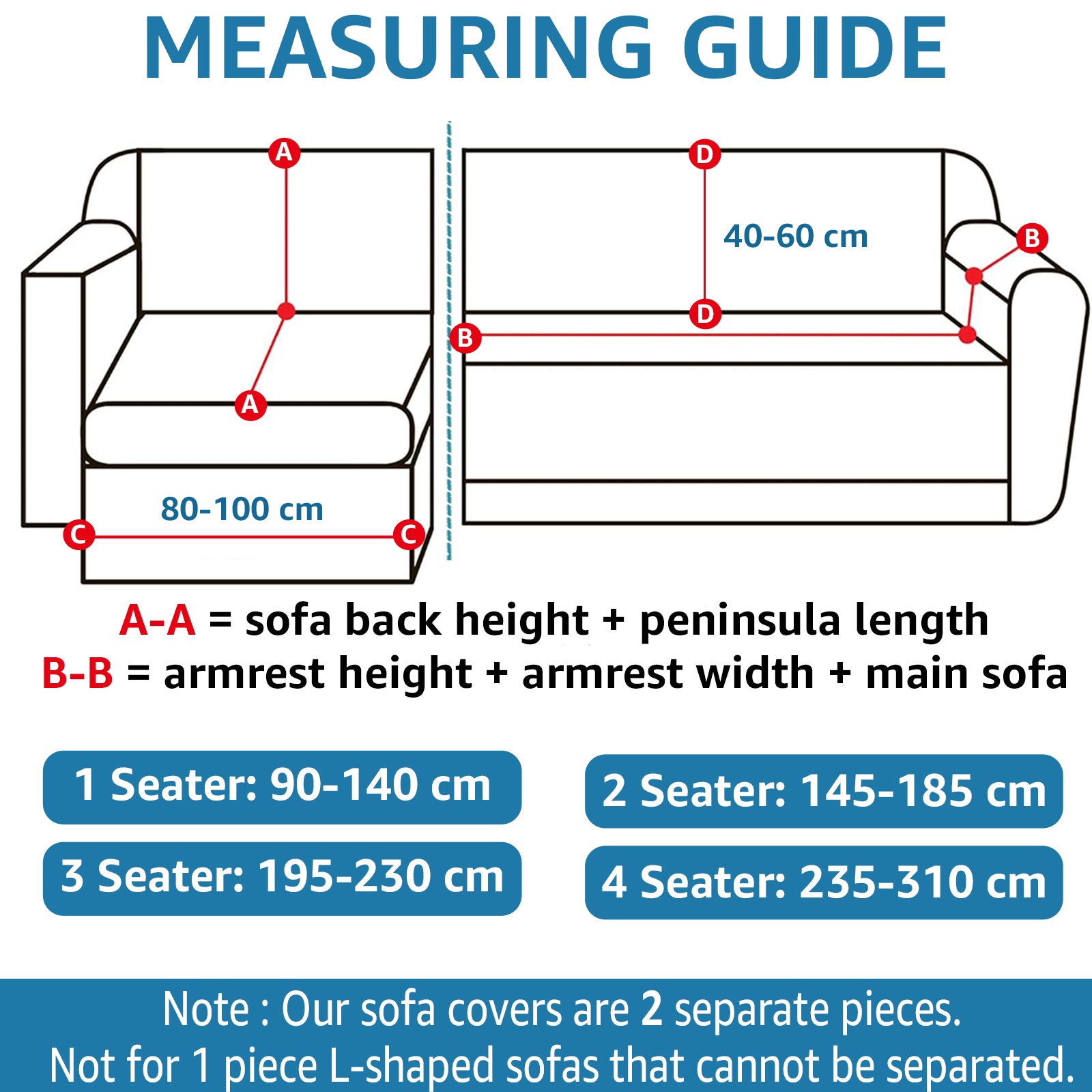 Questo set di coperture per divano angolare consiste di due pezzi: entrambi progettati per la sezione da 2 posti. (145-185 cm).Prima dell'acquisto, si prega di misurare la lunghezza del vostro divano includendo i braccioli (A-A e B-B) per assicurarsi che sia della misura corretta. Progettato per divani ad L dove le due parti possono essere separate, questa copertura presenta un design universale adatto sia per penisole sinistre che destre. Il tessuto elastico morbido garantisce comfort e durata tutto l'anno.
