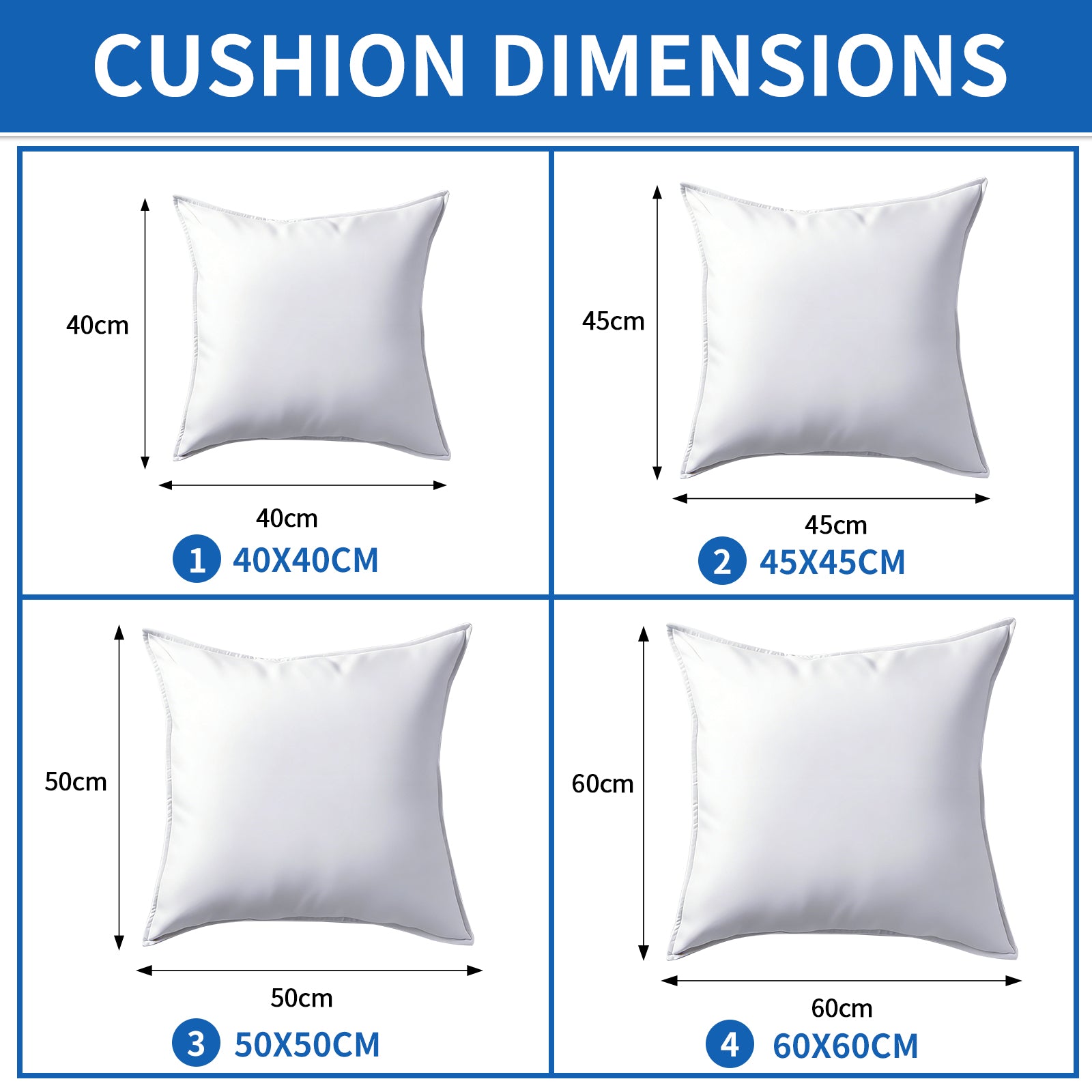 Disponibile in quattro misure quadrate classiche (40×40 cm, 45×45 cm, 50×50 cm e 60×60 cm), così puoi abbinarlo facilmente ai cuscini del tuo divano, letto o sedia per un look ordinato e personalizzato.